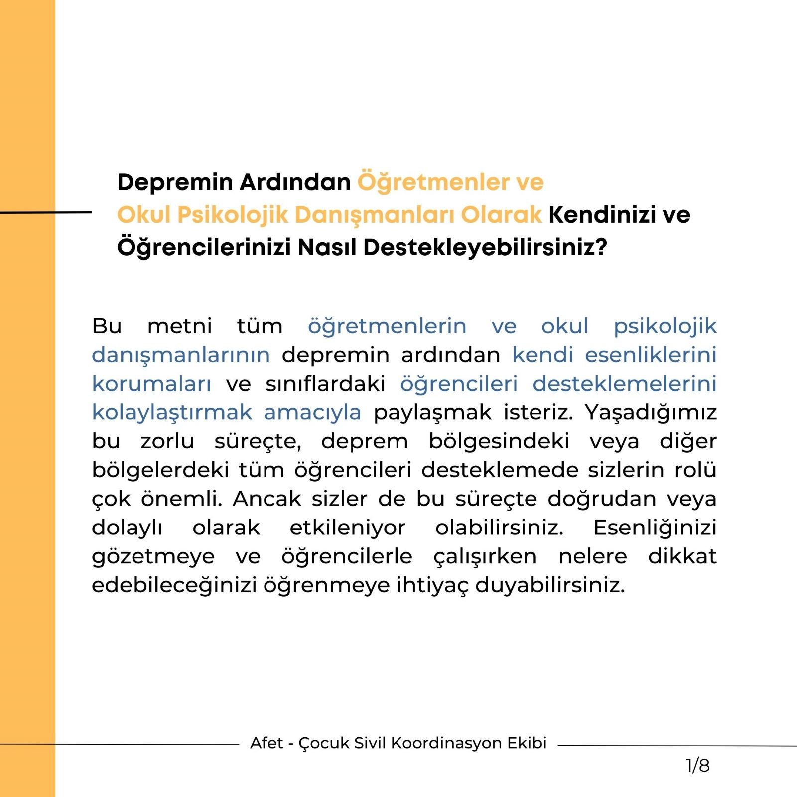 Depremin Ardından Öğretmenler ve Okul Psikolojik Danışmanları Olarak Kendinizi ve Öğrencilerinizi Nasıl Destekleyebilirsiniz? Afet - Çocuk Sivil Koordinasyon Ekibi 1/51 Bu metni tüm öğretmenlerin ve okul psikolojik danışmanlarının depremin ardından kendi esenliklerini korumaları ve sınıflardaki öğrencileri desteklemelerini kolaylaştırmak amacıyla paylaşmak isteriz. Yaşadığımız bu zorlu süreçte, deprem bölgesindeki veya diğer bölgelerdeki tüm öğrencileri desteklemede sizlerin rolü çok önemli. Ancak sizler de bu süreçte doğrudan veya dolaylı olarak etkileniyor olabilirsiniz. Esenliğinizi gözetmeye ve öğrencilerle çalışırken nelere dikkat edebileceğinizi öğrenmeye ihtiyaç duyabilirsiniz.