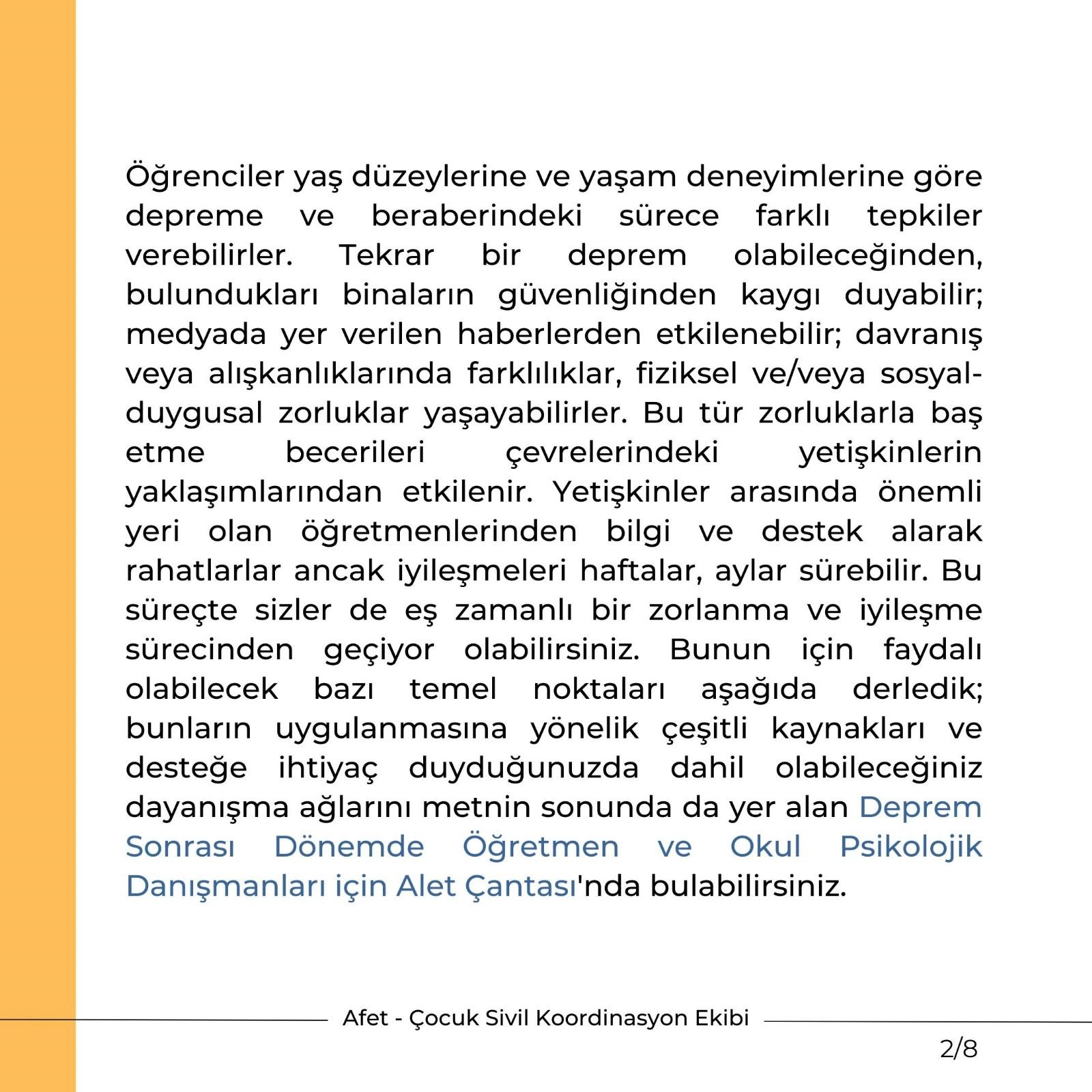 Öğrenciler yaş düzeylerine ve yaşam deneyimlerine göre depreme ve beraberindeki sürece farklı tepkiler verebilirler. Tekrar bir deprem olabileceğinden, bulundukları binaların güvenliğinden kaygı duyabilir; medyada yer verilen haberlerden etkilenebilir; davranış veya alışkanlıklarında farklılıklar, fiziksel ve/veya sosyal-duygusal zorluklar yaşayabilirler. Bu tür zorluklarla baş etme becerileri çevrelerindeki yetişkinlerin yaklaşımlarından etkilenir. Yetişkinler arasında önemli yeri olan öğretmenlerinden bilgi ve destek alarak rahatlarlar ancak iyileşmeleri haftalar, aylar sürebilir. Bu süreçte sizler de eş zamanlı bir zorlanma ve iyileşme sürecinden geçiyor olabilirsiniz. Bunun için faydalı olabilecek bazı temel noktaları aşağıda derledik; bunların uygulanmasına yönelik çeşitli kaynakları ve desteğe ihtiyaç duyduğunuzda dahil olabileceğiniz dayanışma ağlarını metnin sonunda da yer alan Deprem Sonrası Dönemde Öğretmen ve Okul Psikolojik Danışmanları için Alet Çantası'nda bulabilirsiniz.