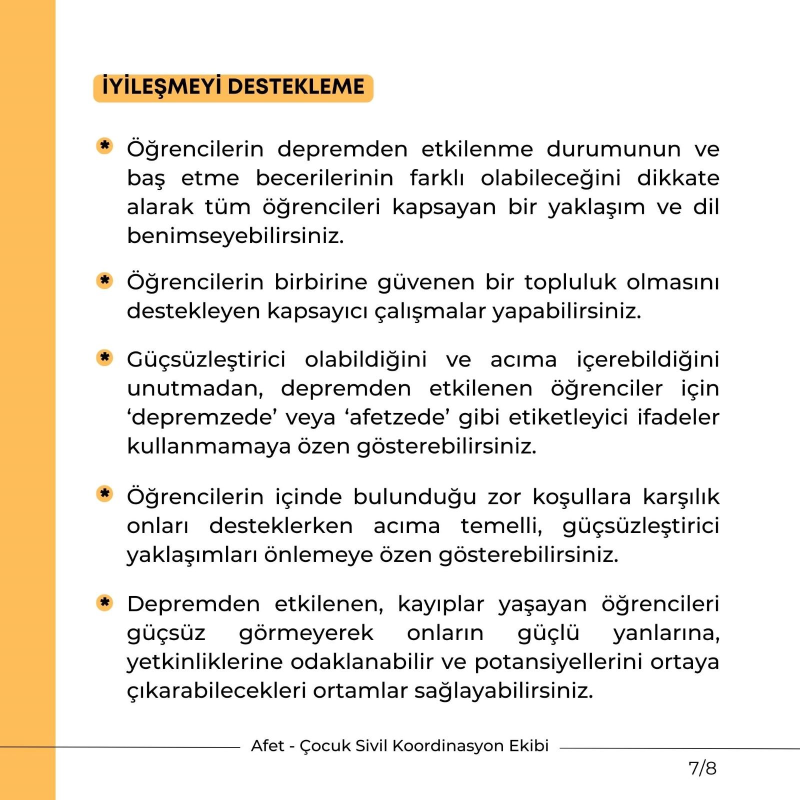 İYİLEŞMEYİ DESTEKLEME Öğrencilerin depremden etkilenme durumunun ve baş etme becerilerinin farklı olabileceğini dikkate alarak tüm öğrencileri kapsayan bir yaklaşım ve dil benimseyebilirsiniz. Öğrencilerin birbirine güvenen bir topluluk olmasını destekleyen kapsayıcı çalışmalar yapabilirsiniz. Güçsüzleştirici olabildiğini ve acıma içerebildiğini unutmadan, depremden etkilenen öğrenciler için ‘depremzede’ veya ‘afetzede’ gibi etiketleyici ifadeler kullanmamaya özen gösterebilirsiniz. Öğrencilerin içinde bulunduğu zor koşullara karşılık onları desteklerken acıma temelli, güçsüzleştirici yaklaşımları önlemeye özen gösterebilirsiniz. Depremden etkilenen, kayıplar yaşayan öğrencileri güçsüz görmeyerek onların güçlü yanlarına, yetkinliklerine odaklanabilir ve potansiyellerini ortaya çıkarabilecekleri ortamlar sağlayabilirsiniz.